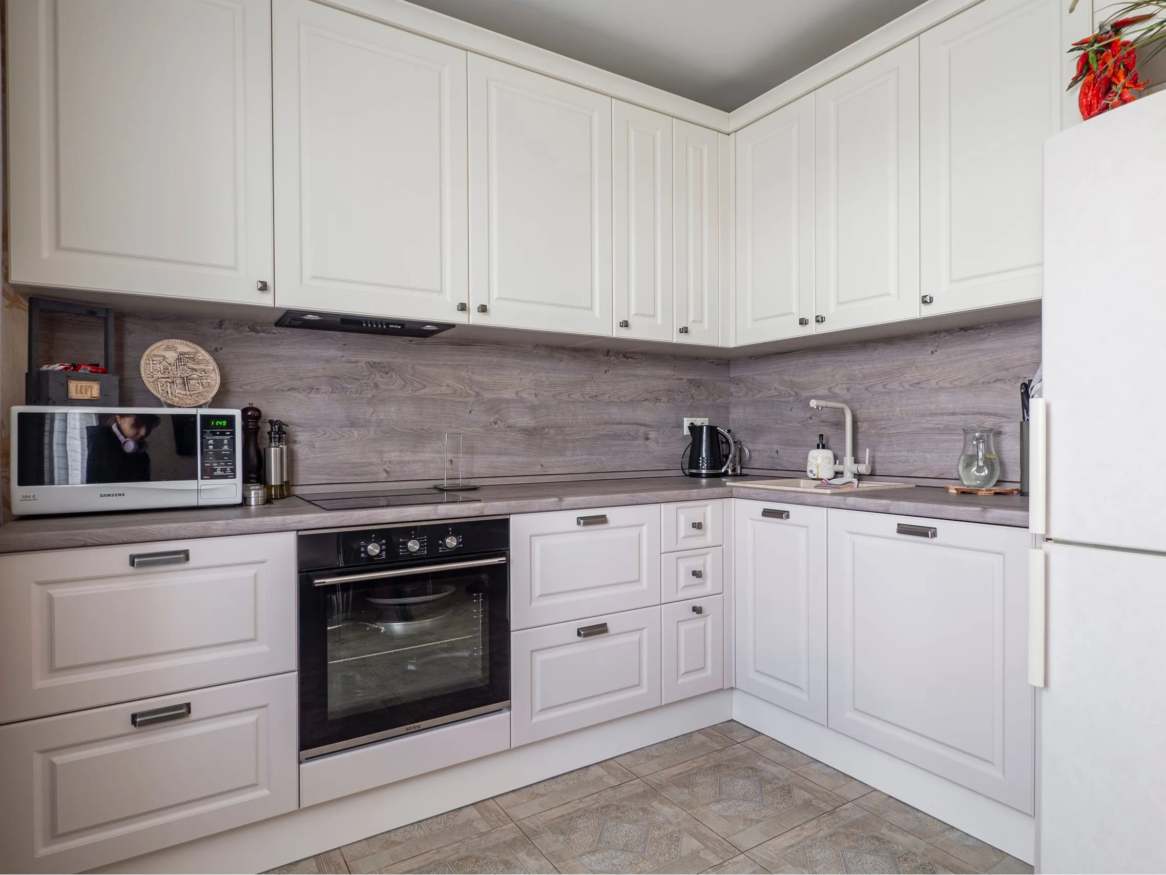 Фасады: МДФ ПВХ Лонгфорд Сатин беж; Лонгфорд Алебастр